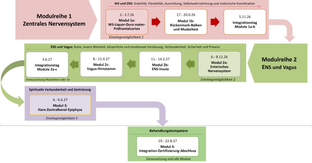 - Es ist auch möglich, erst am 6.11.26 einzusteigen und entweder einzeln das Modul 2a ENS vom 6.-8.11.26 oder gleich die ganze Modulreihe ENS und Vagus (Module 2a-c plus Integrationstag) vom 6.11.26- 3.6.27 zusammen zu buchen.